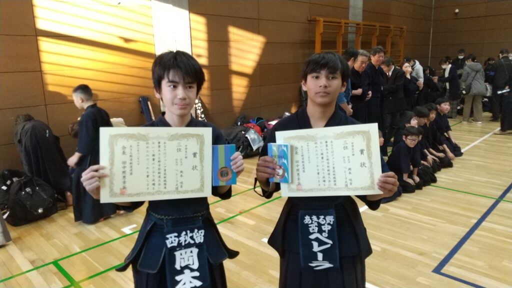 12月7日(日)に開催されました形大会にて、西秋留剣友会所属のペレーラ君と岡本君が中学生の部で三位に入賞しました。